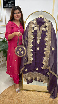 Best seller pure silk light weighted suit material with applique cut work dupatta along with potli GF490 - Purple