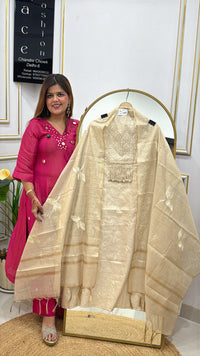 Trending pure linen shimmer silk with designer neck detailing along with flamingo embroidred dupatta GF 473 - Beige
