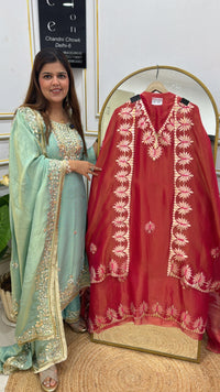 Vibrant and designer festival special pure silk shimmer suit material with latest laser scalped work all over shirt and dupatta GF579 - Red