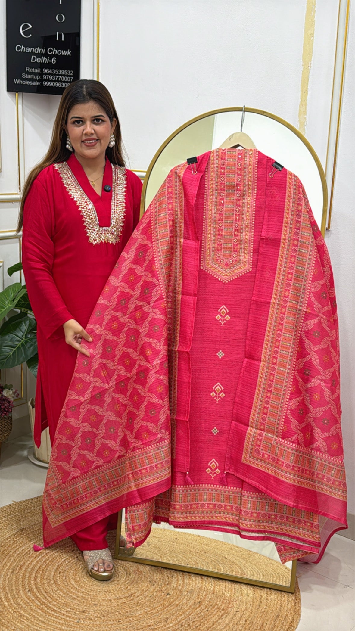 Elevate your ethnic wardrobe with this luxurious pure soft tusser silk material, crafted for timeless elegance and comfort. The suit features a delicate soft neck threadwork design, beautifully complemented with all-over batik weaving that adds an artisanal touch. Its lightweight texture and natural sheen make it perfect for festive occasions, celebrations, or sophisticated everyday wear.